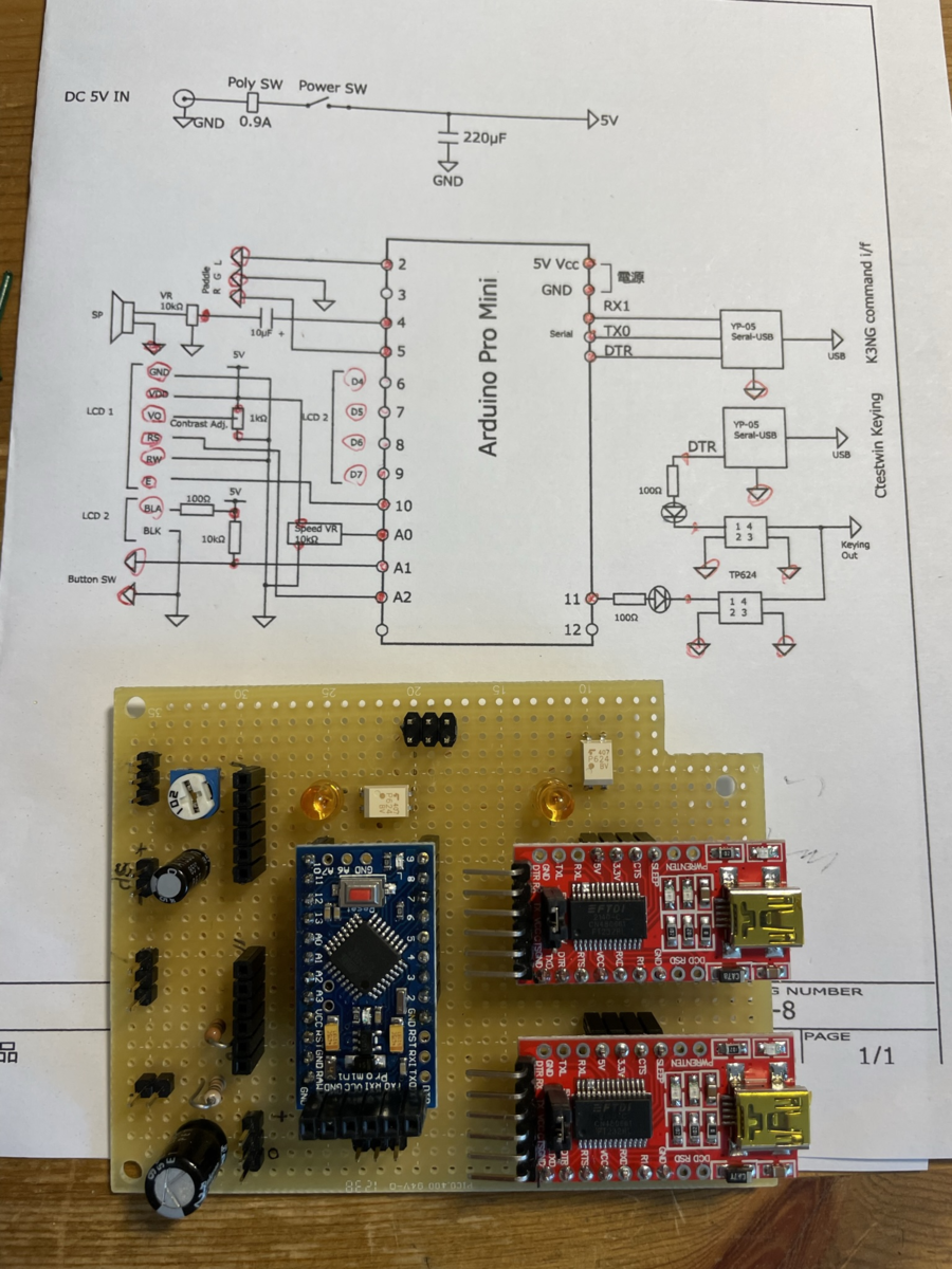 CWエレキー制作4 で制作したエレキーですが、自作プログラムをやめて高性能な K3NG のプログラムに入れ替えました。といってもプログラムだけではなく、基盤も作り直し。最初に作ったエレキーは自作プログラムで、パドルの入力もチャタリング防止のため 74HC04 を載せていましたが論理が逆になってしまい、K3NG をそのまま載せられなかったので、回路も全部変更しました。