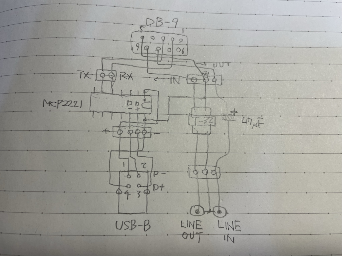 2023-07-25 FT-897 の FT8 インターフェース(3) CAT FT8 アマチュア無線 電子工作 部品はそろったので今日は組み立てるだけです。 こんな感じで接続。 FT-897用ですが、とりあえず手近の FT-817 で動作確認しました。CAT も WSJT-X で問題無く認識されました。後で気が付きましたが、FT-897 は CAT/DATA コネクタ位置が左右逆になっています。 一応、手書きの回路図です。 2m の FT8 を聞いてみましたが、平日なので静かでした。。